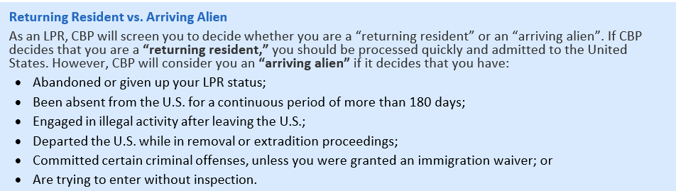 Updated for 2025: Heightened Enforcement at Ports of Entry Like all international travelers, lawful permanent residents (LPRs)—also known as Green Card holders—are subject to inspection by U.S. Customs and Border Patrol (CBP) when arriving at an airport or land port of entry. While LPRs enjoy greater rights than nonimmigrants when returning to the United States after travel abroad, all noncitizens now face increased scrutiny at the border for past immigration issues, interactions with police, and political activity. It is important that you know your rights when returning to the United States. Secondary Inspection: If questions arise and CBP is unable to admit you quickly, you may be taken to a separate area for “secondary inspection.” Being sent for a secondary inspection by itself does not necessarily mean you are in trouble, but you may be held anywhere from a few minutes to several hours or longer. During secondary inspection, CBP
