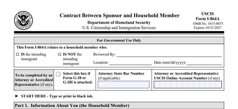 I-864A 表格適用於當家庭成員—例如配偶、成年子女、父母或其他同住親屬—願意將其收入與擔保人的收入合併,以達到最低收入要求時。該家庭成員必須願意與擔保人共同承擔支持受益人的責任,並簽署 I-864A 表格。